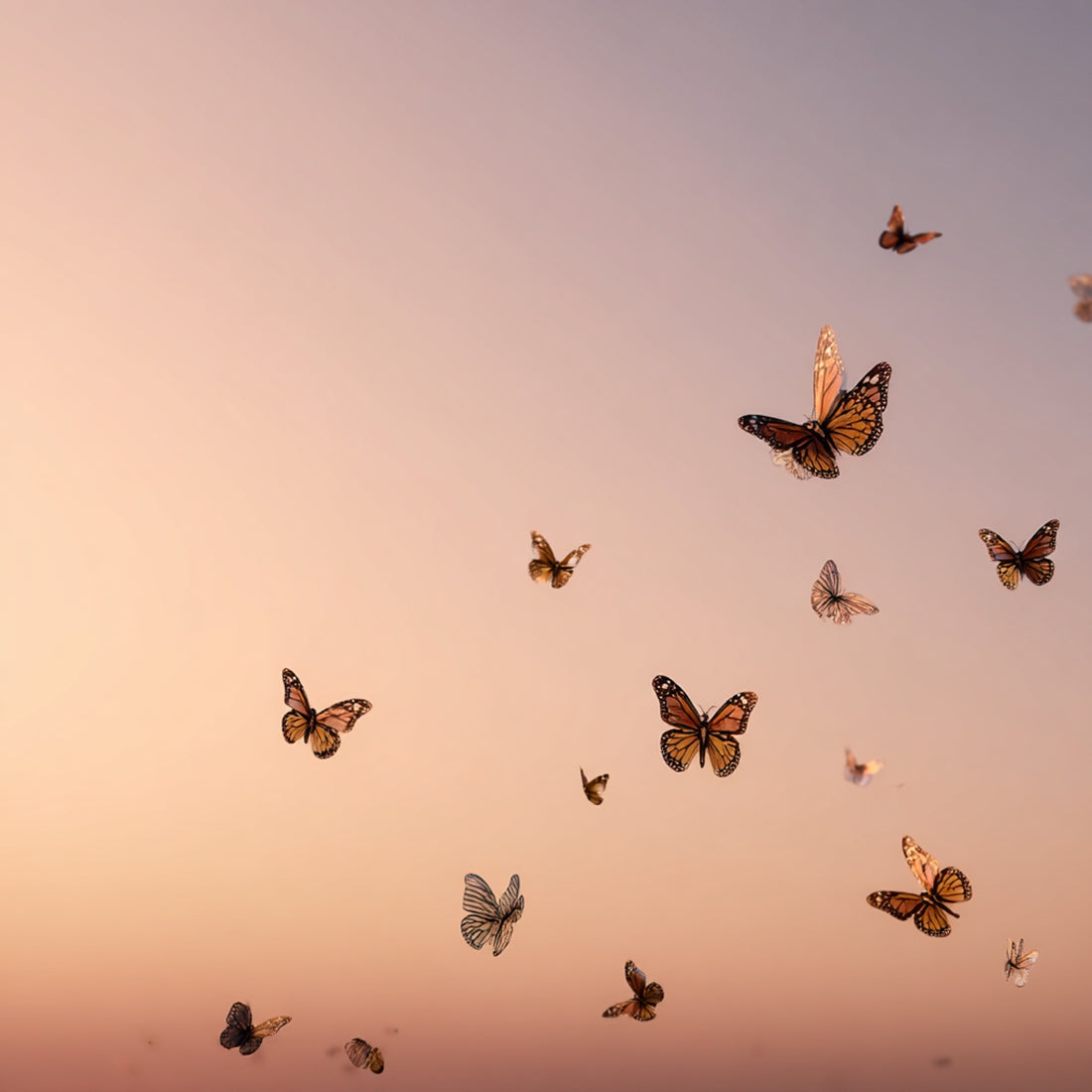 This collection captures butterflies in quiet cinematic moments — suspended over water, resting in stillness, drifting across open skies.