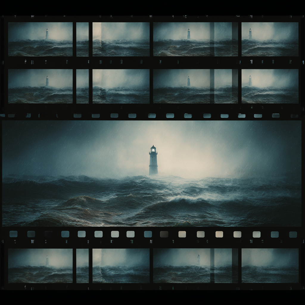 This artwork captures a solitary lighthouse standing against rolling ocean waves, framed through layered filmstrip textures that echo the rhythm of passing moments. Soft atmospheric haze and cool, desaturated tones create a cinematic stillness โ a scene that feels both powerful and contemplative.